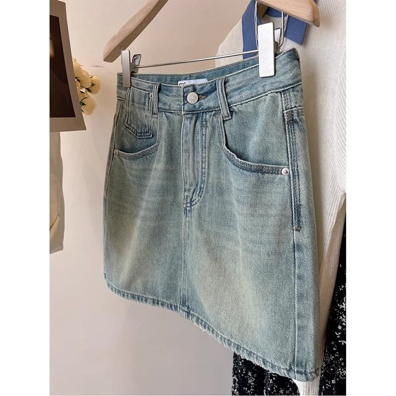 تنورة دينم نسائية صيفية فاتحة اللون، فتاة سمينة رفيعة، مقاس كبير، خصر عالي، بطن نحيف يغطي الورك، تنورة على شكل ذراع على شكل حرف A