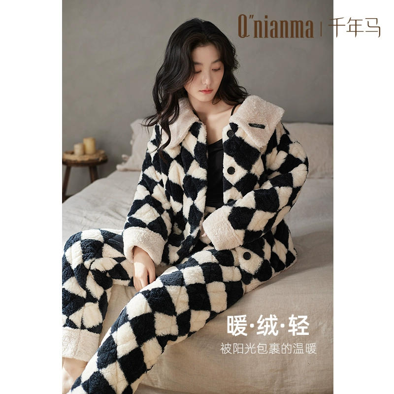 بيجامة شتوية نسائية ثلاث طبقات مبطنة بالمخمل فلانيلة سميكة يمكن ارتداؤها في الخارج طقم ملابس منزلية مخمل مرجاني دافئ