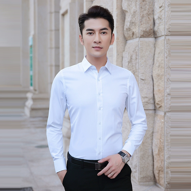 قميص أزرق بأكمام طويلة على الطراز الكوري مضاد للتجاعيد وغير قابل للكي