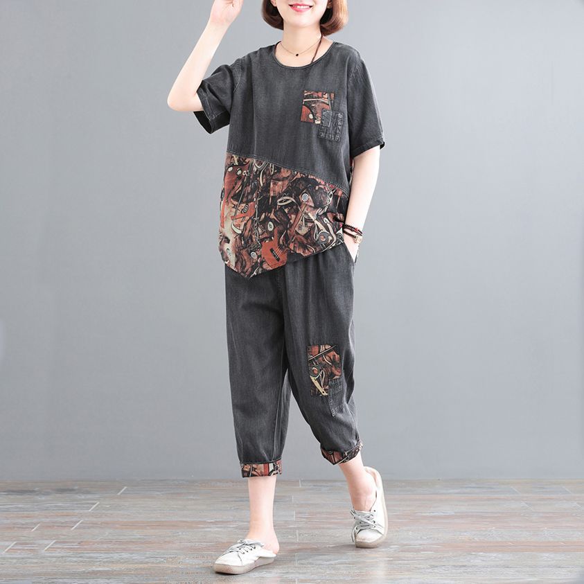 جديد الصيف دعوى المرأة موضة أنيقة حجم كبير فضفاض القطن رقيقة الدنيم قصيرة الأكمام أعلى قطعتين اقتصاص السراويل