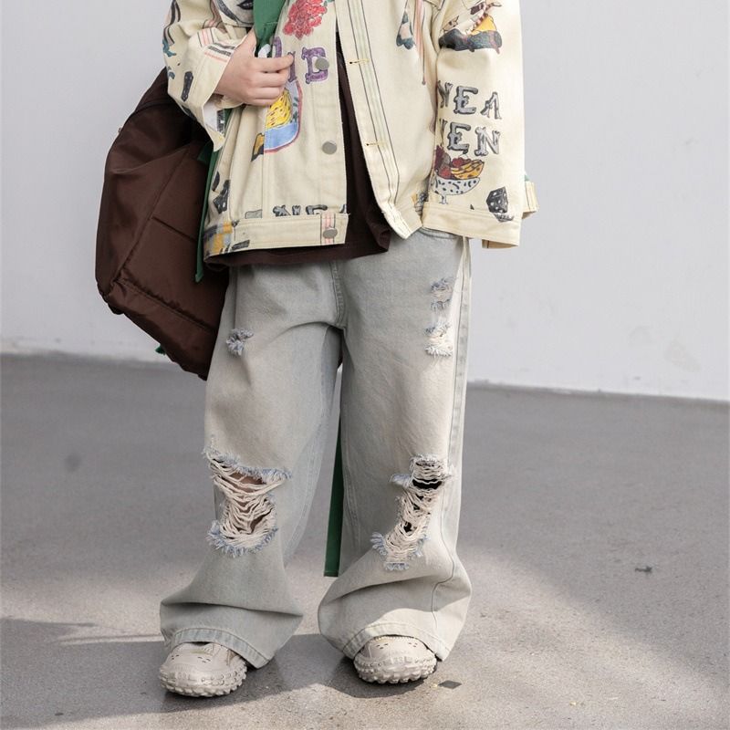النمط الكوري 2024 ربيع جديد للأولاد جينز مستقيم ممزق بتصميم كلاسيكي للأطفال متوسطين وصغار بناطيل فضفاضة
