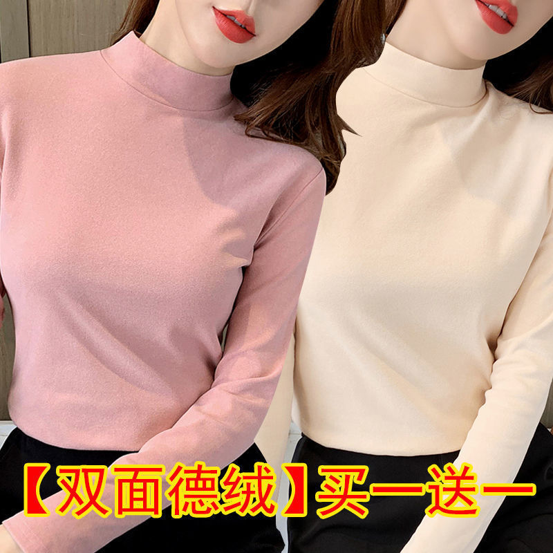 قميص أسود أساسي للسيدات ضيق من قطعتين مخملي على الوجهين نصف ياقة عالية للخريف مناسب للجميع وأكمام طويلة