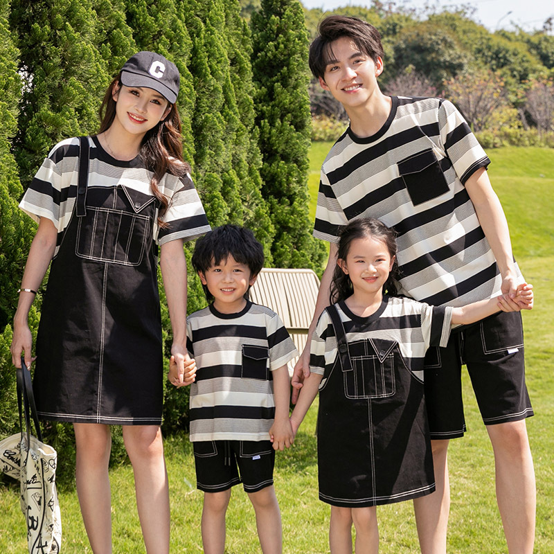 بدلة مخططة للوالدين والطفل جديدة 2023 فستان صيفي للأم والبنت بدلة عائلية لثلاثة وأربعة شارع مقلي