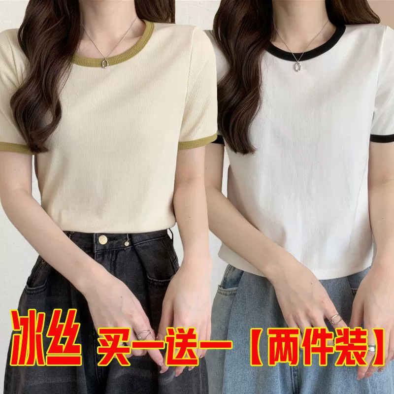واحد/قطعتين الحرير الجليد تي شيرتات قصيرة الاكمام المرأة الصيف فضفاضة ضئيلة التباين اللون جولة الرقبة تنوعا قاع أعلى Ins
