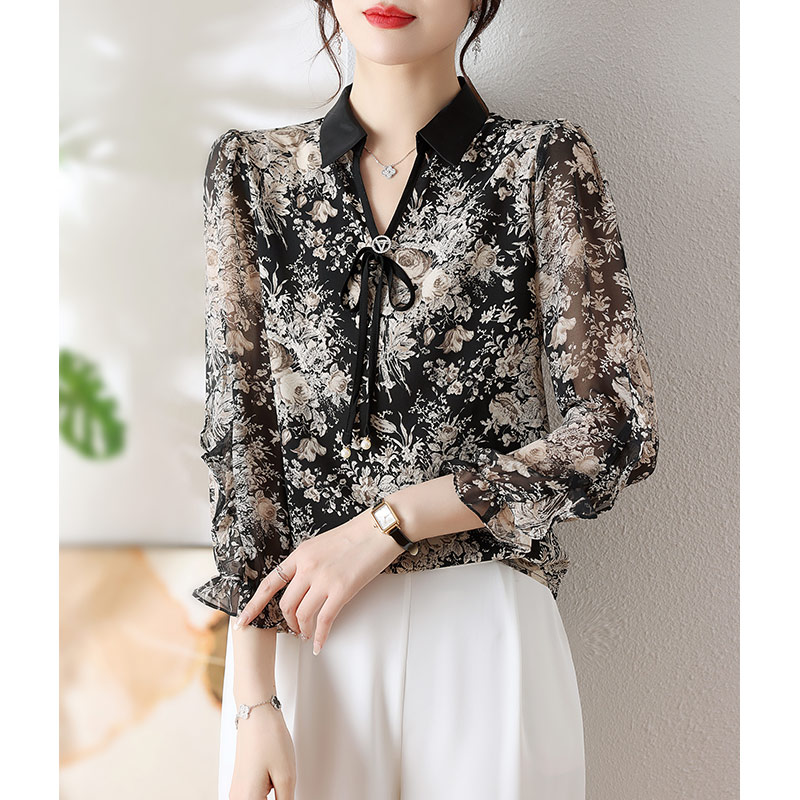 قميص ربيعي للأم في منتصف العمر بأكمام طويلة قميص شيفون جديد لربيع وصيف 2024 للنساء في منتصف العمر