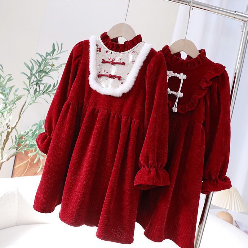 احتفالية السنة الجديدة فستان الفتاة النمط الصيني مشبك فستان أحمر الخريف والشتاء للأطفال فستان الأميرة سميكة مبطنة بالصوف