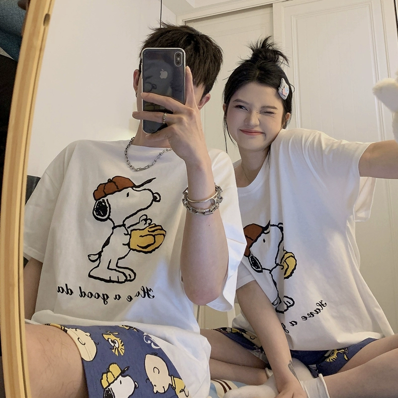 بيجامة للزوجين من الكرتون سنوبي نمط صيفي من القطن الخالص بأكمام قصيرة للأولاد والبنات طقم ملابس منزلية يمكن ارتداؤها راقية