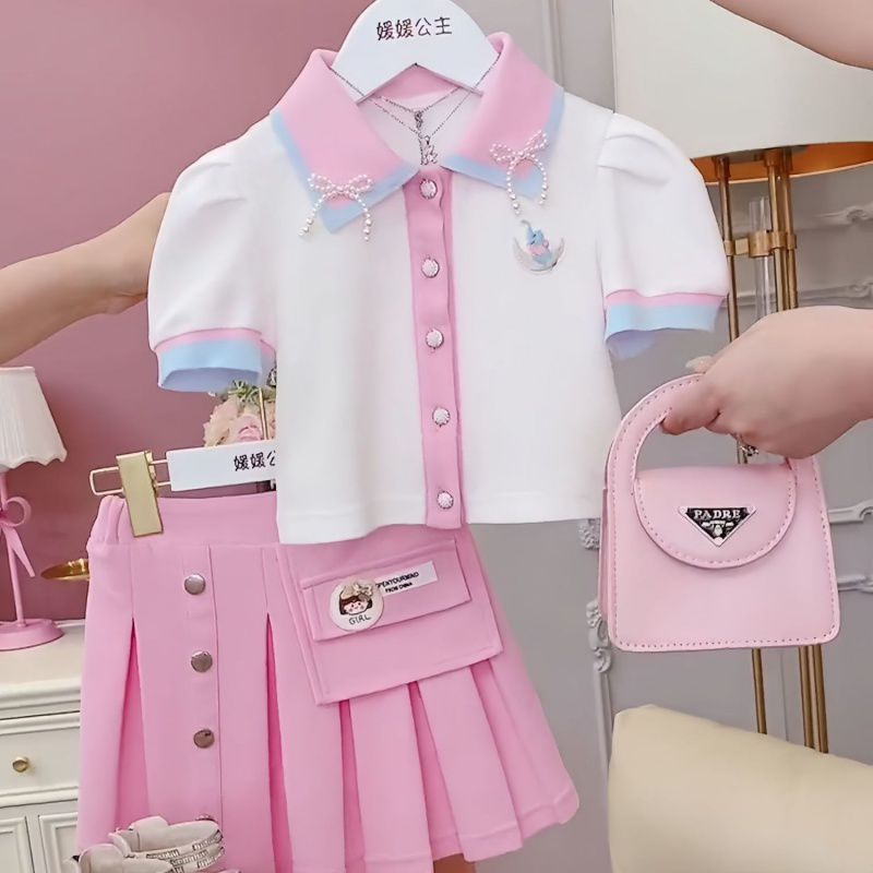 بدلة قميص بولو عصرية للفتيات الصغيرات على الطراز الغربي اللطيف بنمط الأكاديمية الكورية فستان صيفي للفتيات بأكمام قصيرة وتنورة مكونة من قطعتين