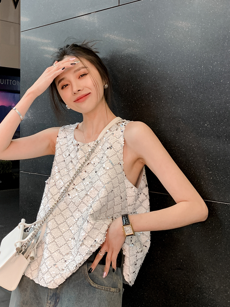 بلوزة بيضاء فضفاضة بدون أكمام مصممة بالترتر المعين
