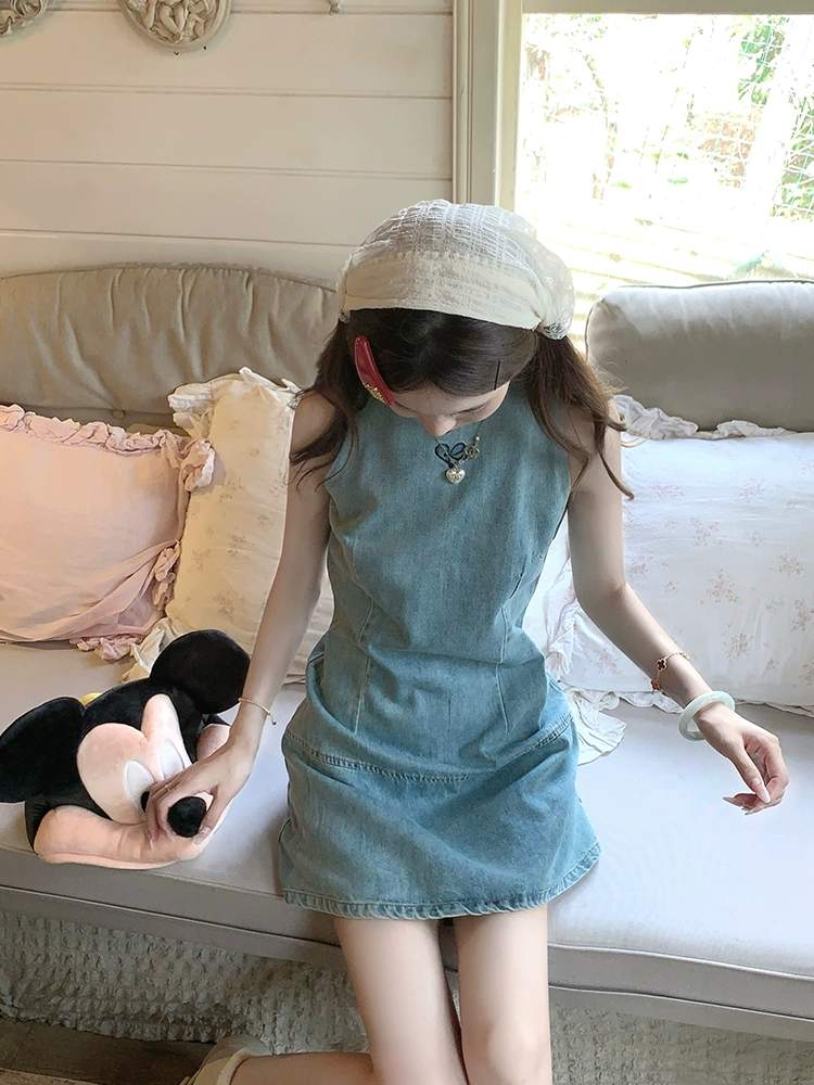 بلوزة زرقاء طويلة بدون أكمام للنساء برقبة دائرية.