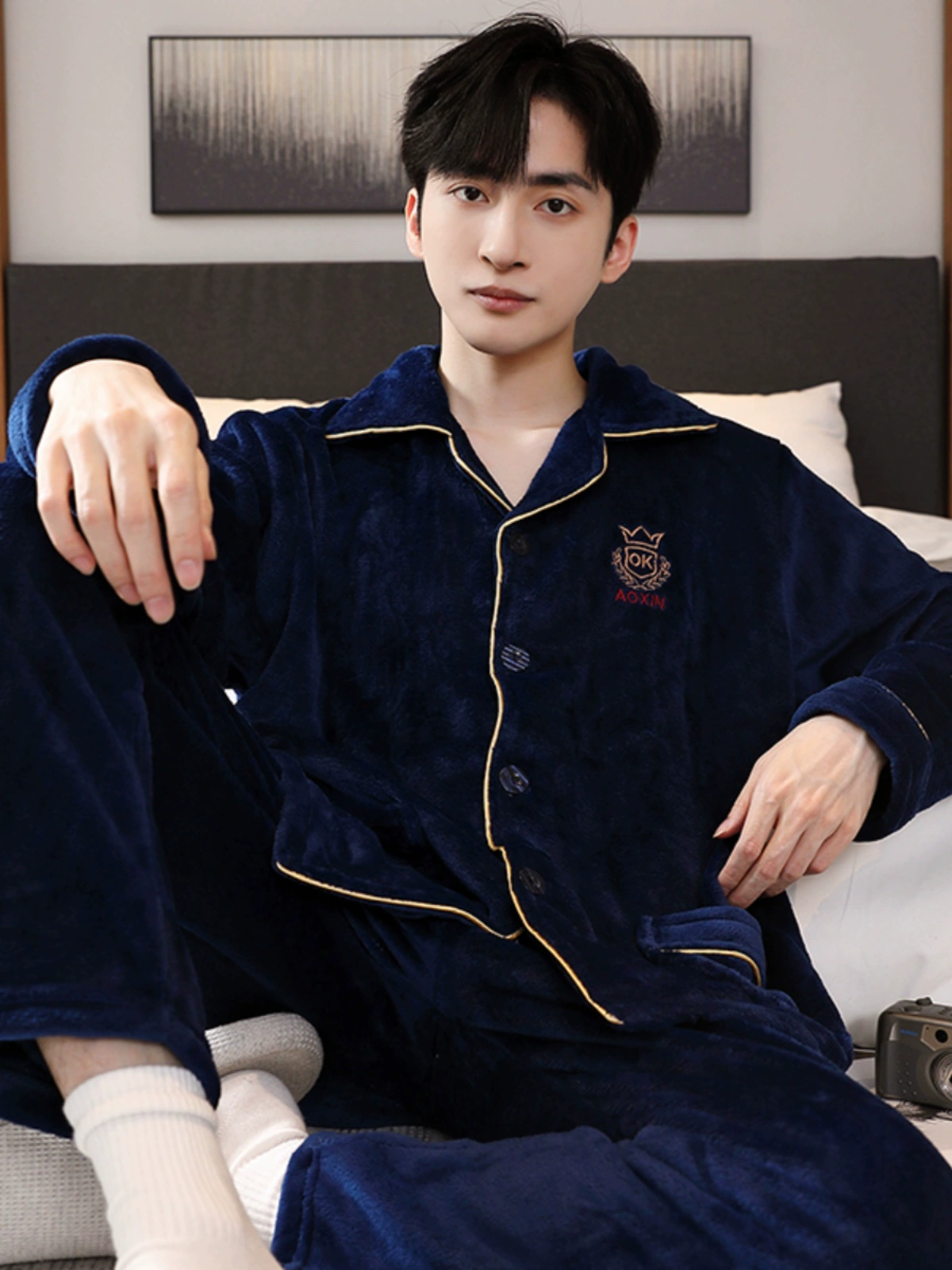 بيجامة رجالية بأكمام طويلة للخريف والشتاء من الفلانيل سميكة مخملية دافئة للشتاء المرجاني المخملي سترة ملابس منزلية مجموعة
