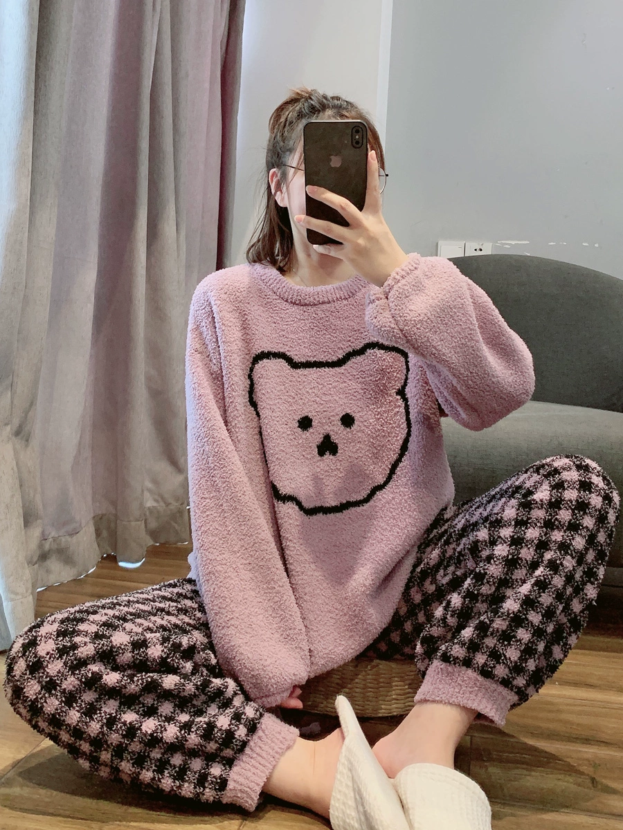 بيجامة منقوشة على شكل دب ناعمة للنساء شتوية سميكة ومخملية مجموعة ملابس منزلية مخملية مرجانية لطيفة يمكن ارتداؤها في الخارج