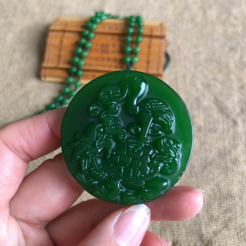سلحفاة كرين اليشم قلادة قلادة بطاقة مستديرة الامبراطوري الأخضر قلادة من اليشم زوجين التنين السلاحف سترة سلسلة غانوديرما اليشم كرين قلادة