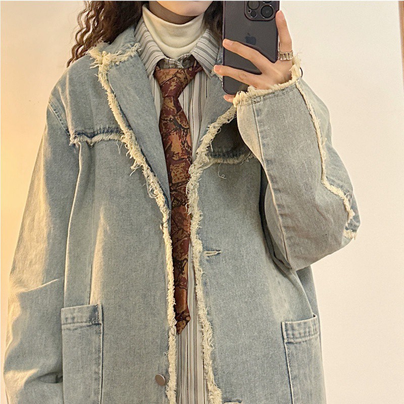 معطف دينم أمريكي فضفاض جديد ربيعي جديد لعام 2024 ذو طية صدر السترة وغسل خشن أمريكي قديم للنساء