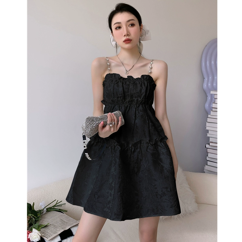 عطلة الأسود حجر الراين الحمالة رقيق ألف خط اللباس تنورة قصيرة الإناث تصميم الشعور الأميرة فستان عيد ميلاد الحلو