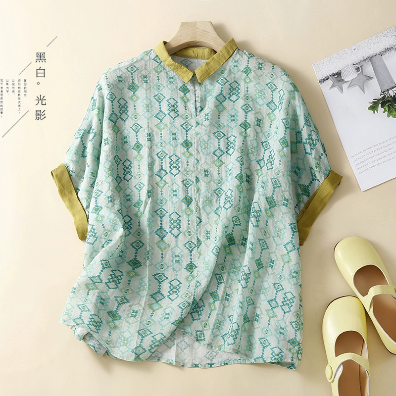 قميص علوي من الكتان الرقيق بأكمام قصيرة للنساء من التجارة الخارجية