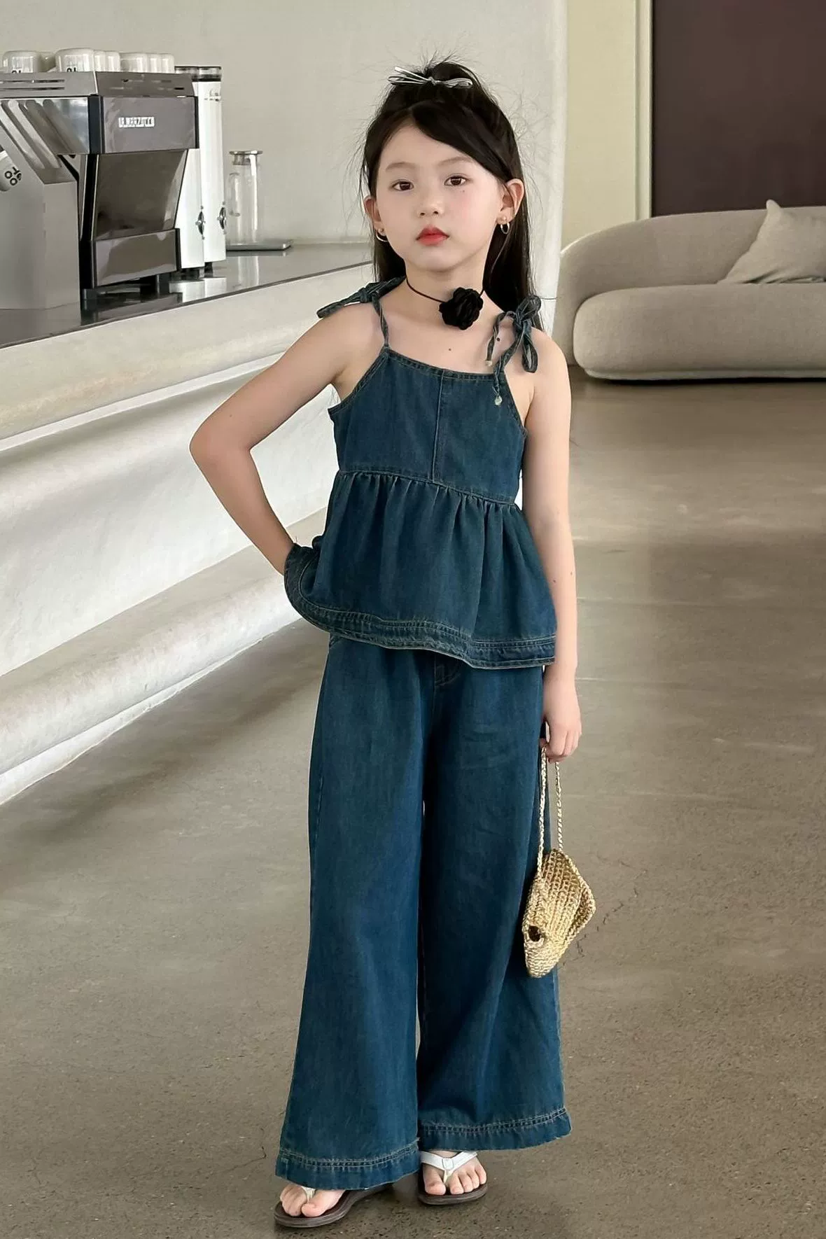 بدلة بناتي صيفية من الدنيم 2024 بدلة فتاة صغيرة جديدة مثيرة على طراز فتاة بروتيل بنطال بأرجل واسعة طقم مكون من قطعتين قسم رفيع