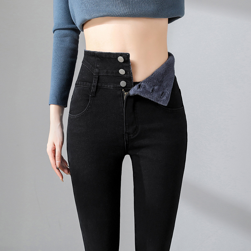 جينز سميك عالي الخصر مبطن بالصوف سروال نسائي ضيق للخريف والشتاء جديد للتنحيف ضيق أسود عالي الارتفاع سروال نسائي