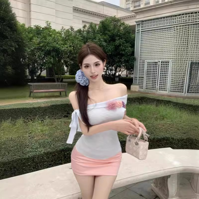 رغبة نقية نمط ثلاثي الأبعاد زهرة الكتف قصيرة الأكمام تي شيرت المرأة الصيف 2024 جديد سليم صالح الكتف الأعلى الراقية الشعور