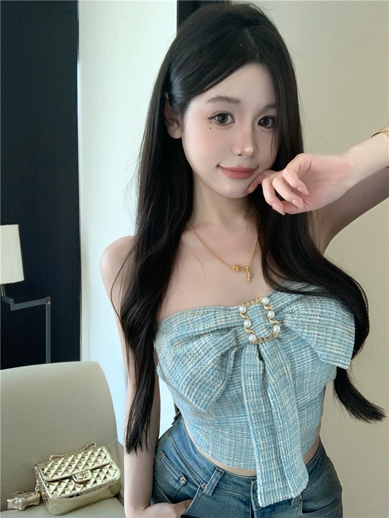بلوزة Xiaoxiangfeng بدون أكمام للسيدات صيفية بفيونكة زرقاء