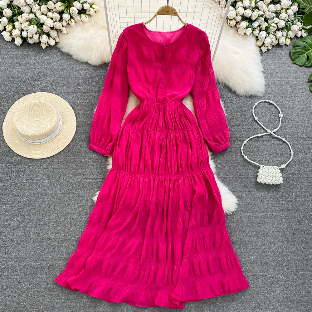 فستان عتيق مطوي وأكمام طويلة ورقبة دائرية على شكل حرف A وحاشية كاملة
