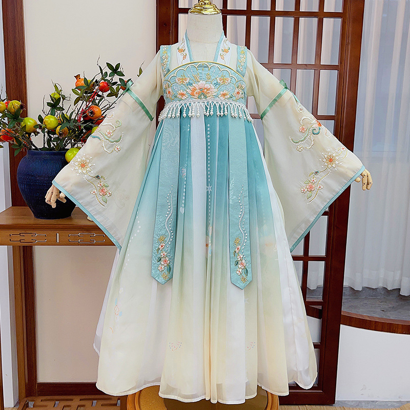 مصنع 2024 جديد ربيع وخريف الفتيات بدلة تانغ العتيقة للأطفال النمط الصيني فستان أزرق كم طويل تنورة Hanfu