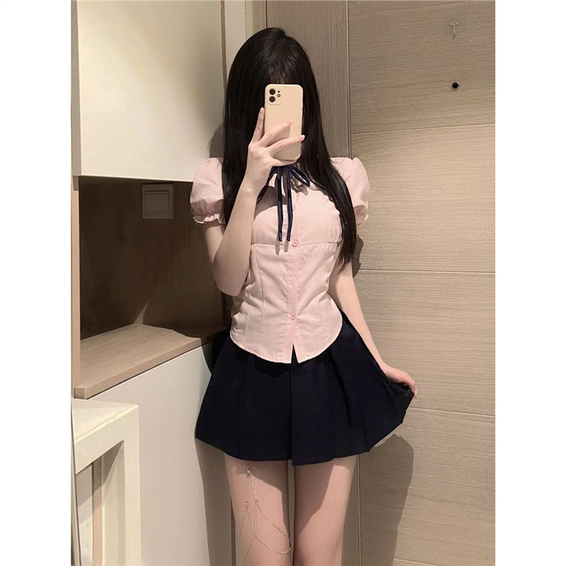 كلية نمط JK موحدة قصيرة الأكمام قميص الإناث مزاجه الرغبة النقية تصميم الشعور التخسيس ضيق الخصر قميص تصميم الشعور أعلى الصيف