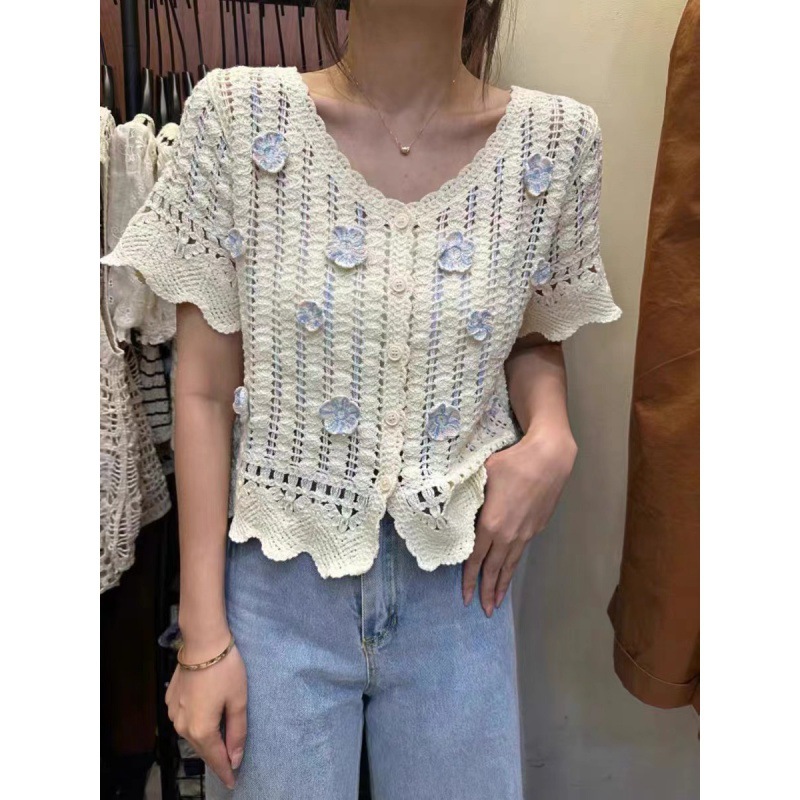 سترة نسائية صيفية بأكمام قصيرة مجوفة على شكل زهرة على الطراز الكوري، بلوزة أنيقة بصدر واحد وقصة ضيقة