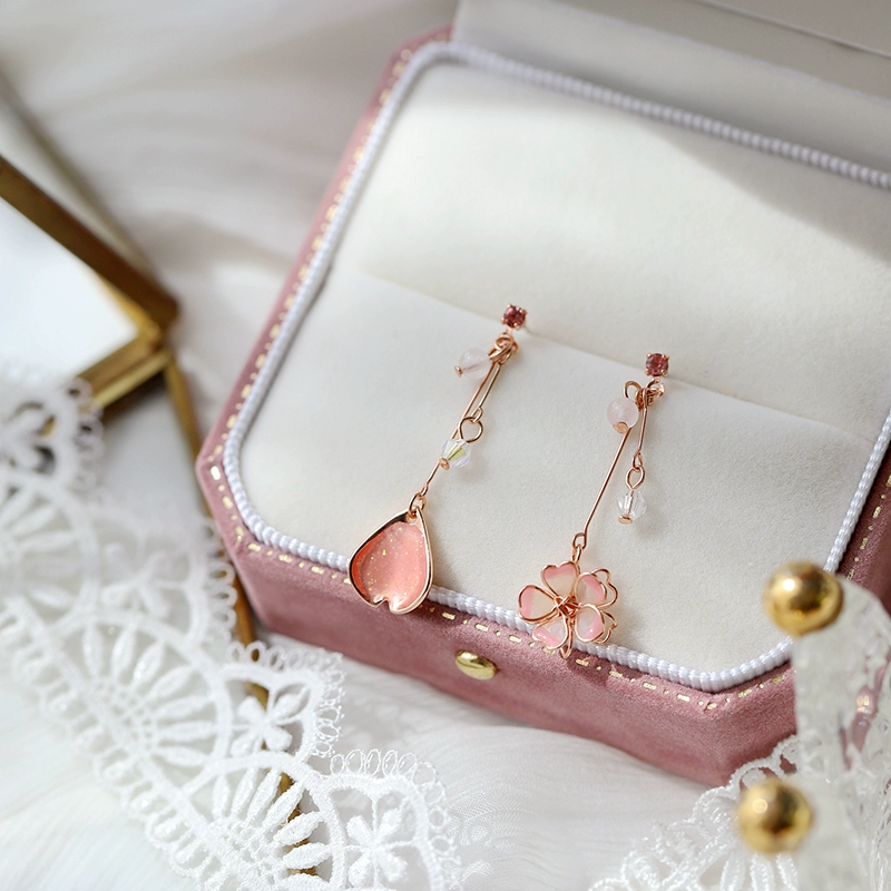 أقراط الفتاة غير المتماثلة الجنية زهر الكرز الفضي الطويل
