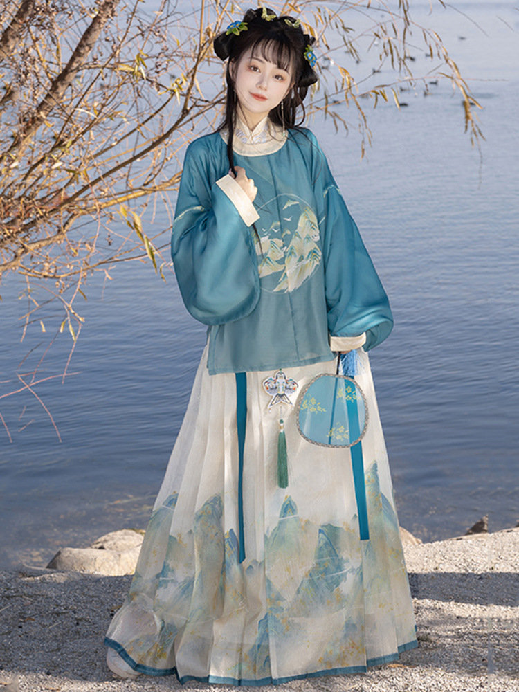 هان يو كوي هان يو كوي الملابس الصينية الأصلية النسائية [Qianli Jiangshan] رداء برقبة دائرية مصنوع من مينغ تنورة وجه الحصان مطبوعة يوميًا بأسلوب الربيع والصيف