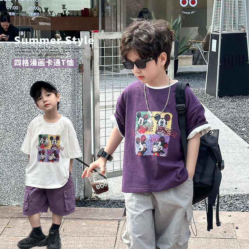 تي شيرت Emo Beibei للأطفال على الطراز الغربي رائع 2024 صيفي بأربعة أقسام رسوم متحركة لطيفة بأكمام قصيرة للأولاد والبنات