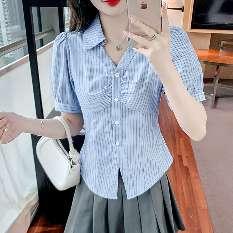قميص نسائي صيفي جديد غير رسمي متعدد الاستخدامات لعام 2024 للبيع بالجملة قميص نسائي فرنسي أنيق برقبة على شكل حرف v وأكمام فقاعية