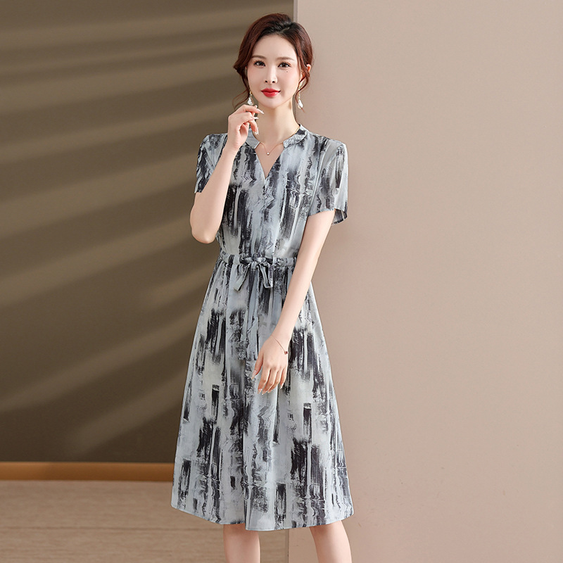 فستان الأم صيف جديد في منتصف العمر وكبار السن المرأة فوق الركبة تنورة طويلة حجم كبير موضة الشيفون تنورة مطبوعة