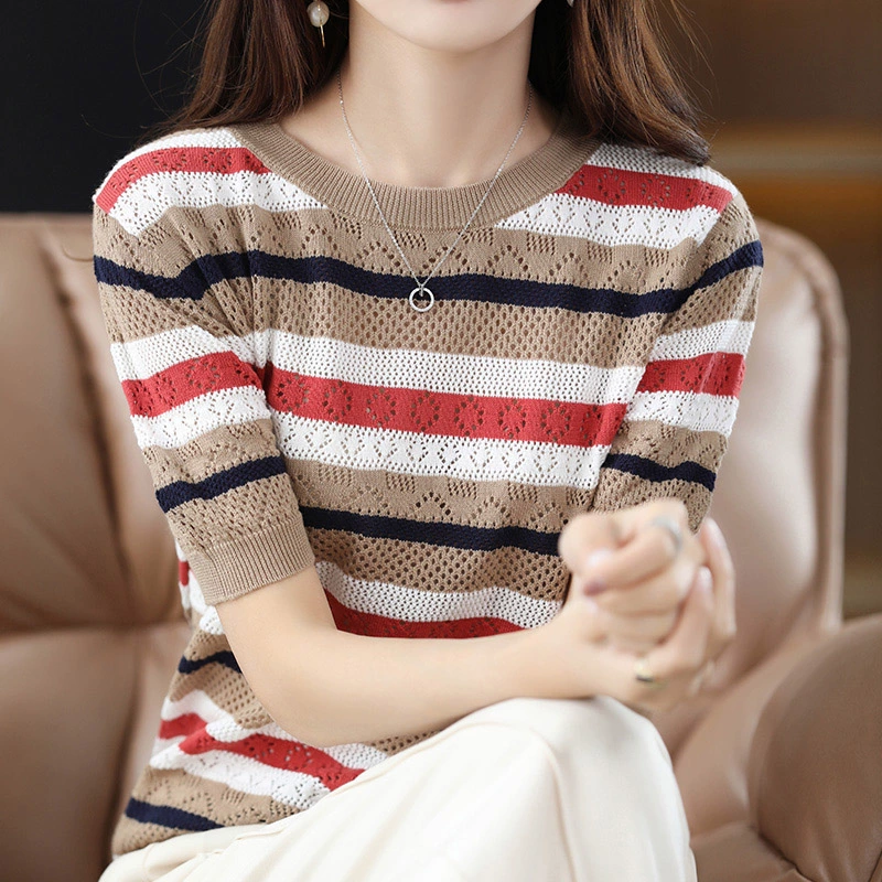 سترة عصرية بأكمام قصيرة ورقبة دائرية من الحرير الجليدي على الطراز الكوري