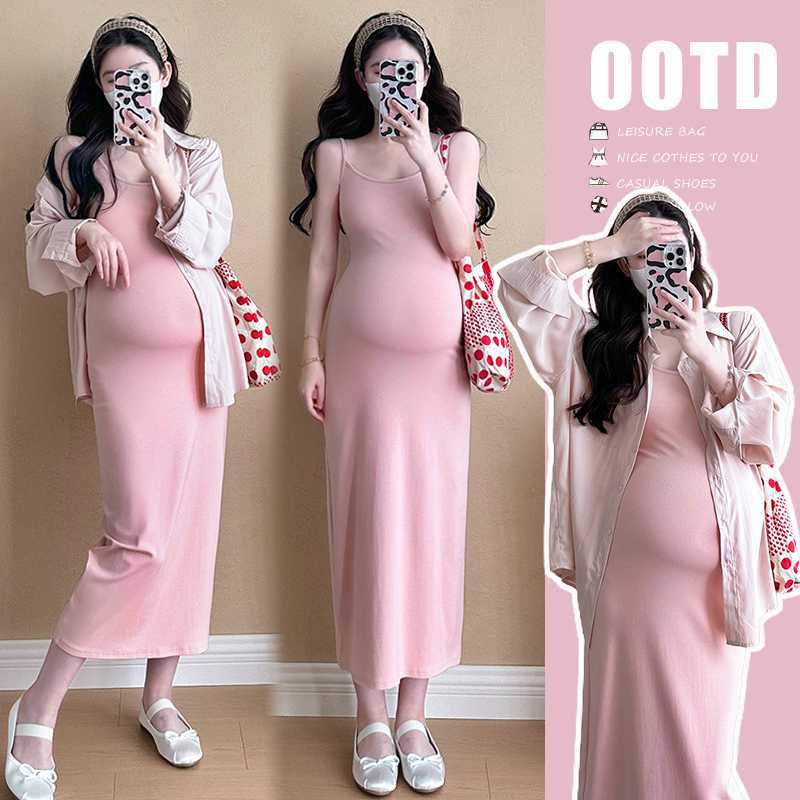 2024 الصيف فستان حمل موضة بسيطة قطعتين نمط جديد قميص الفرنسية سليم صالح الورك النساء الحوامل زلة تنورة