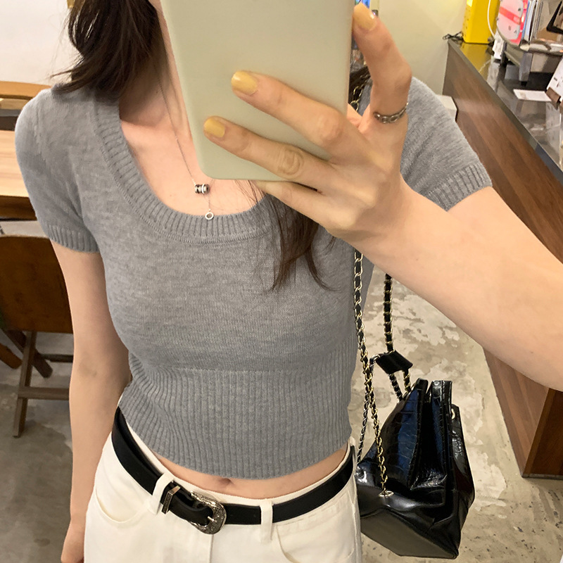 محبوك قصيرة الأكمام تي شيرت المرأة 2024 صيف جديد النمط الفرنسي U-طوق الترقوة تسرب الحلو والساخن ضيق تصميم البنطال القصير