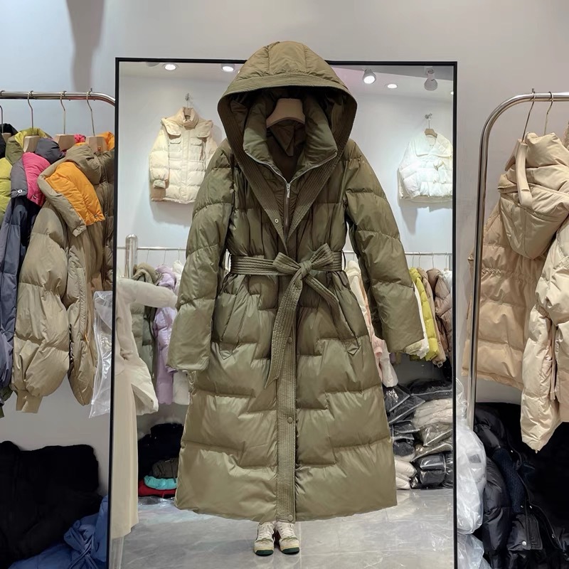 سترة نسائية جديدة لشتاء 2023 باللون الأبيض على شكل بطة أسفل الخصر ضيقة طويلة برباط للتنحيف مع غطاء للرأس سترة نسائية سميكة فوق الركبة بقلنسوة خارجي