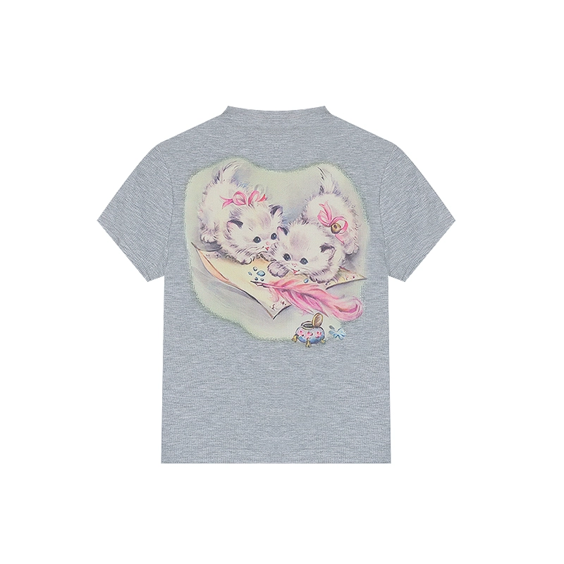 طباعة قطة صفراء بأكمام قصيرة ورسوم كارتونية دوبامين ضيقة