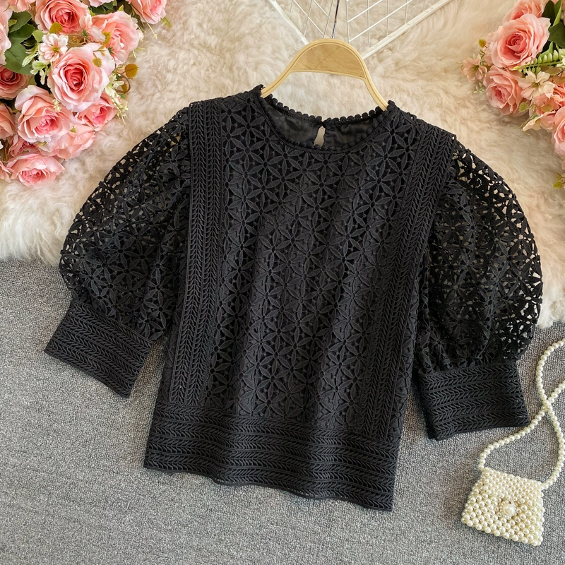 بلوزة من الدانتيل قابلة للذوبان في الماء بأكمام ثلاثة أرباع ورقبة دائرية مع نمط كروشيه