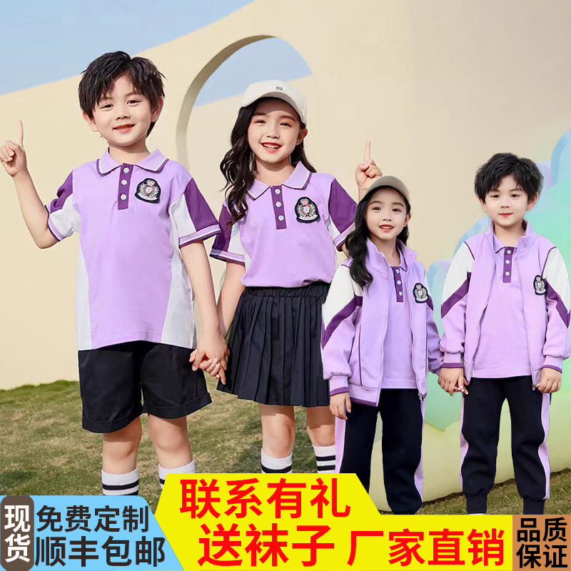 ملابس الصيف الأرجوانية لرياض الأطفال على طراز الكلية ملابس رياضية بأكمام قصيرة للربيع والخريف زي مدرسي مكون من أربع قطع لطلاب المدارس الابتدائية