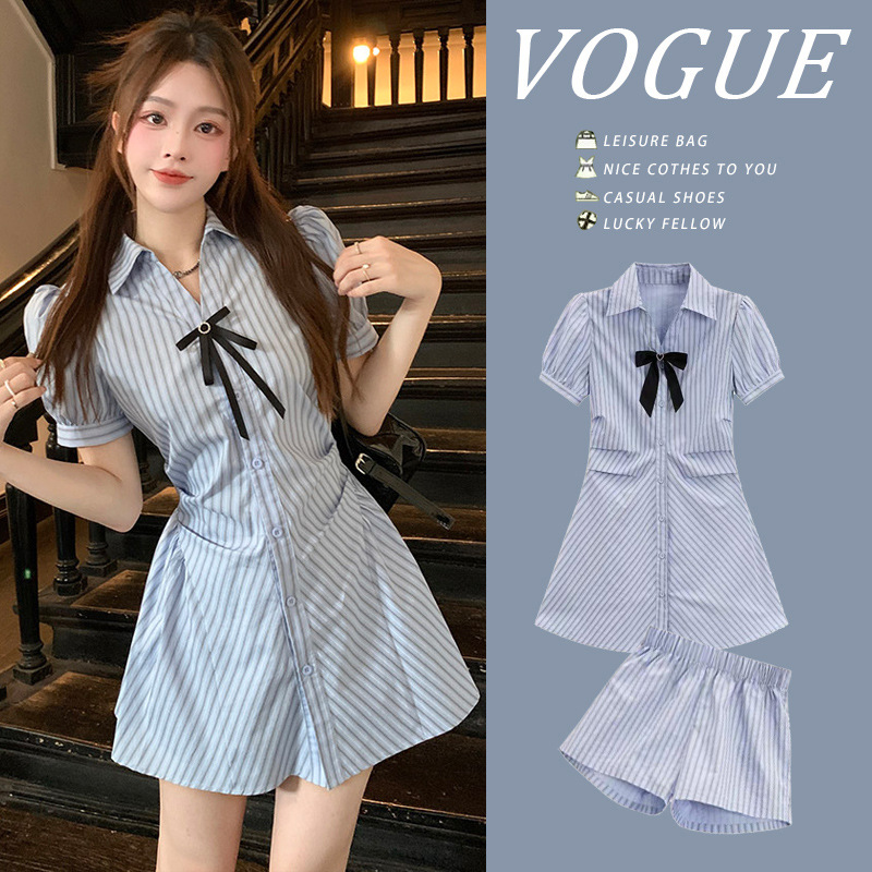 بدلة تمريض للأمهات للخروج 2024 بدلة على طراز الكلية بخصر نحيف وقميص مخطط وسروال عالي الخصر