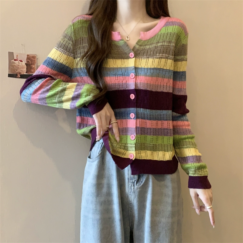 الكورية نمط الحلو ممزق محبوك تي شيرت بأكمام طويلة المرأة الصيف رقيقة واقية من الشمس بلوزة سليم صالح فريد شيك