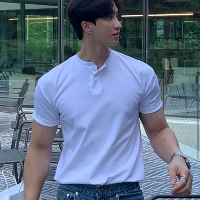 النمط الأمريكي الرجعية الثقيلة الوزن قصيرة الأكمام تي شيرت الرجال قميص بولو ناضجة وثابتة ضيق الكفة اللياقة البدنية الرجل القوي هنري قميص