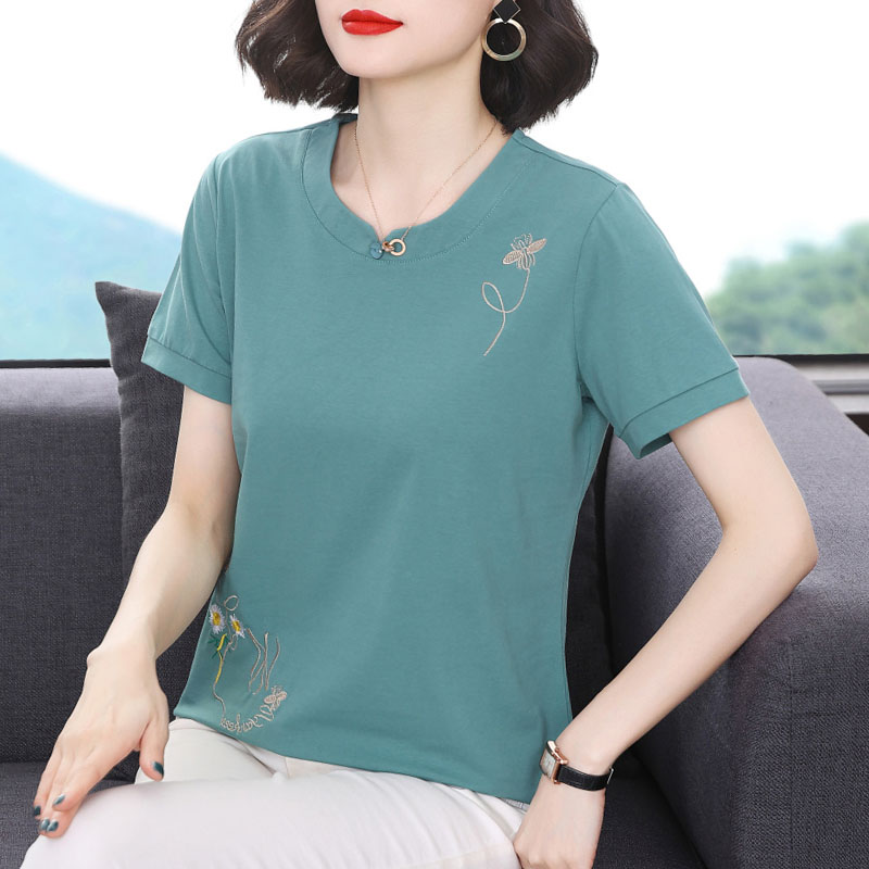 تي شيرت قطني بأكمام قصيرة للنساء فضفاض 2024 صيفي نمط جديد قميص نصف كم على الطراز الغربي للأم في منتصف العمر وكبار السن تي شيرت علوي