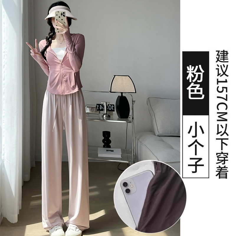 رمادي داكن الحرير الجليد واقية من الشمس بنطال ذو قصة أرجل واسعة المرأة الصيف رقيقة 2024 جديد عالية الخصر الثنيات مكافحة البعوض قناع التبريد السراويل