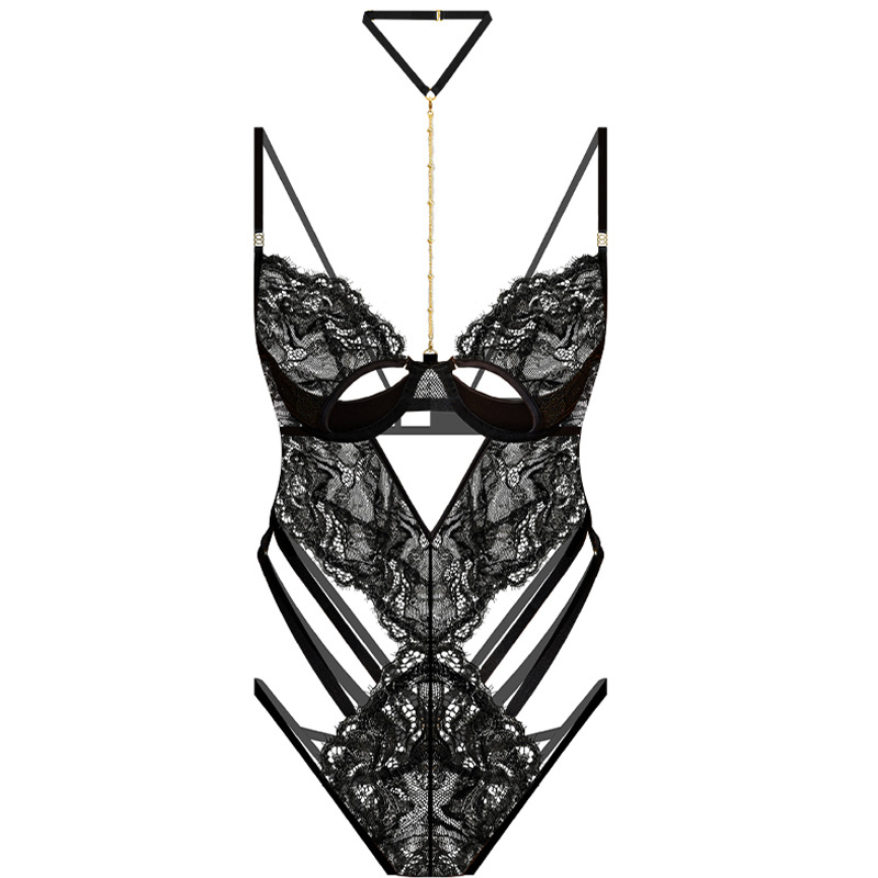 جمبسوت عالي الجودة من الدانتيل المذهب بسلسلة من الفولاذ للنساء بدون إقلاع مثير ومنظور مجوف موحد 73054