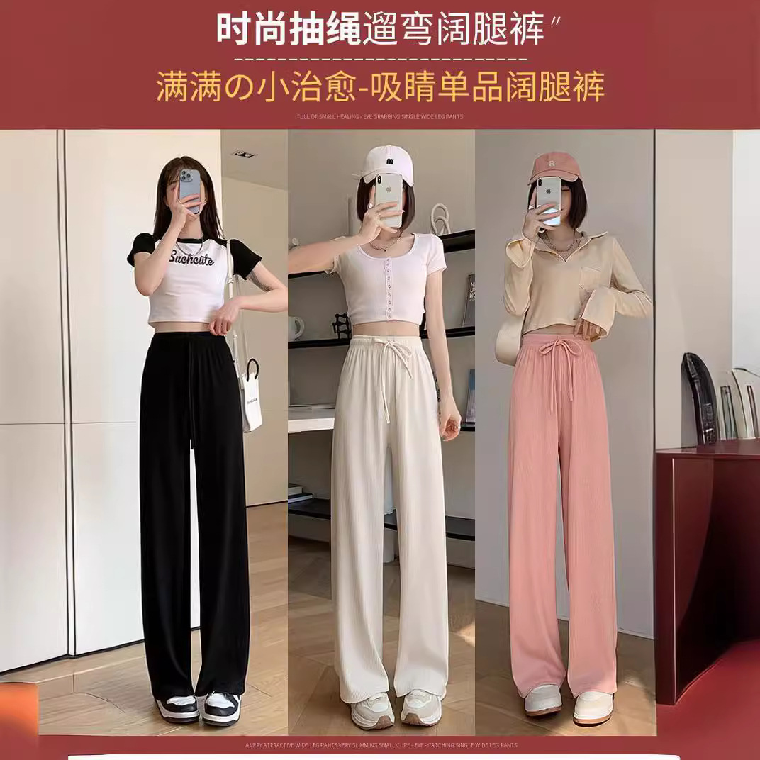 2024 الربيع والصيف جديد الحرير الجليد موضوع واسعة الساق السراويل بلون عالية الخصر اقتصاص السراويل لا جيب رداء غير رسمية السراويل