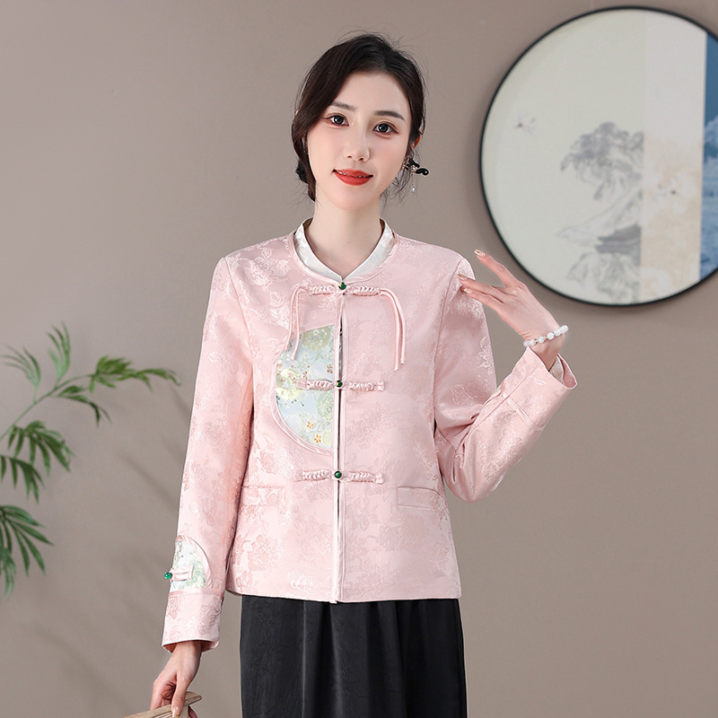 التوت الحرير قميص جديد النمط الصيني النمط الوطني قصيرة المرأة معطف الخريف خمر شرابة مشبك تانغ المطرزة