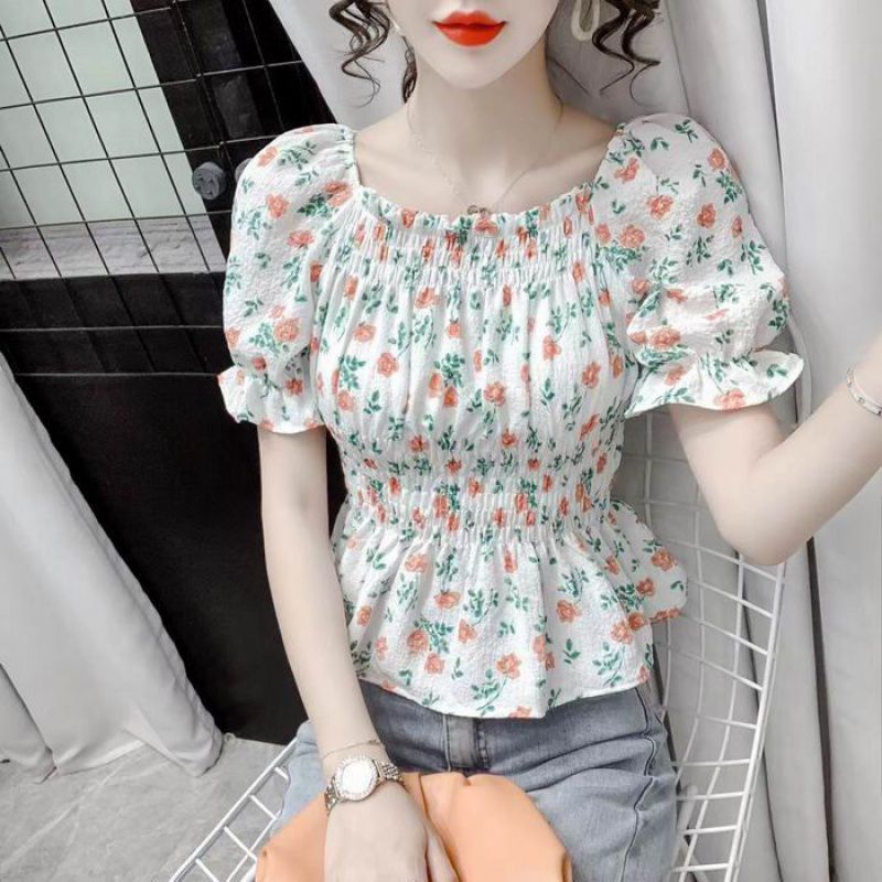 قميص نسائي صيفي صغير بأكمام منتفخة مزين بالزهور قميص نسائي صيفي جديد فرنسي بأكمام قصيرة وخصر ضيق يغطي البطن على الطراز الكوري