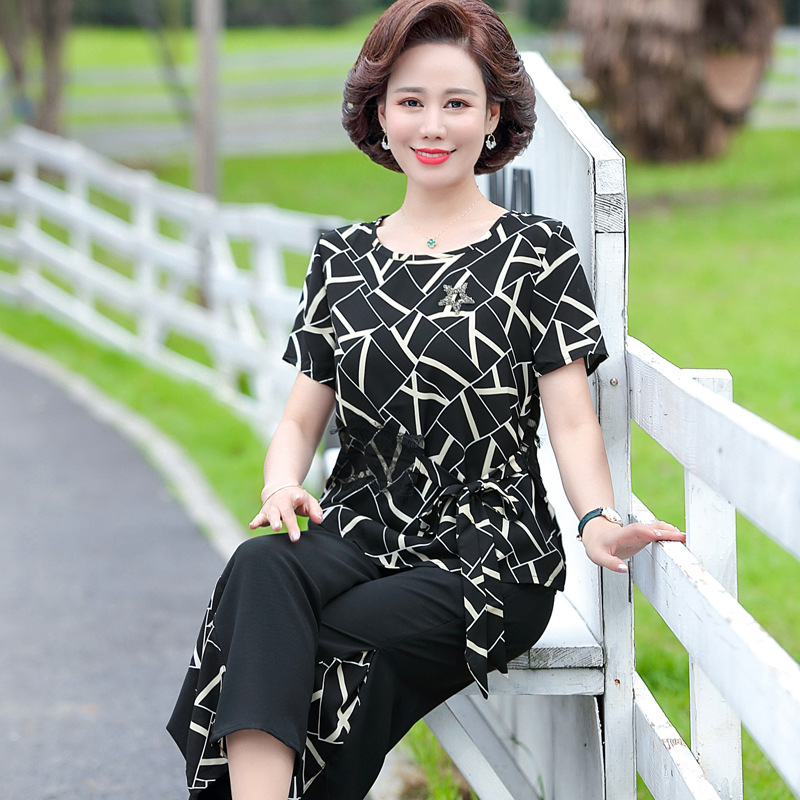 تي شيرت شيفون بأكمام قصيرة على الموضة الغربية للأم في منتصف العمر مكون من قطعتين 2024 جديد في منتصف العمر وكبار السن للسيدات